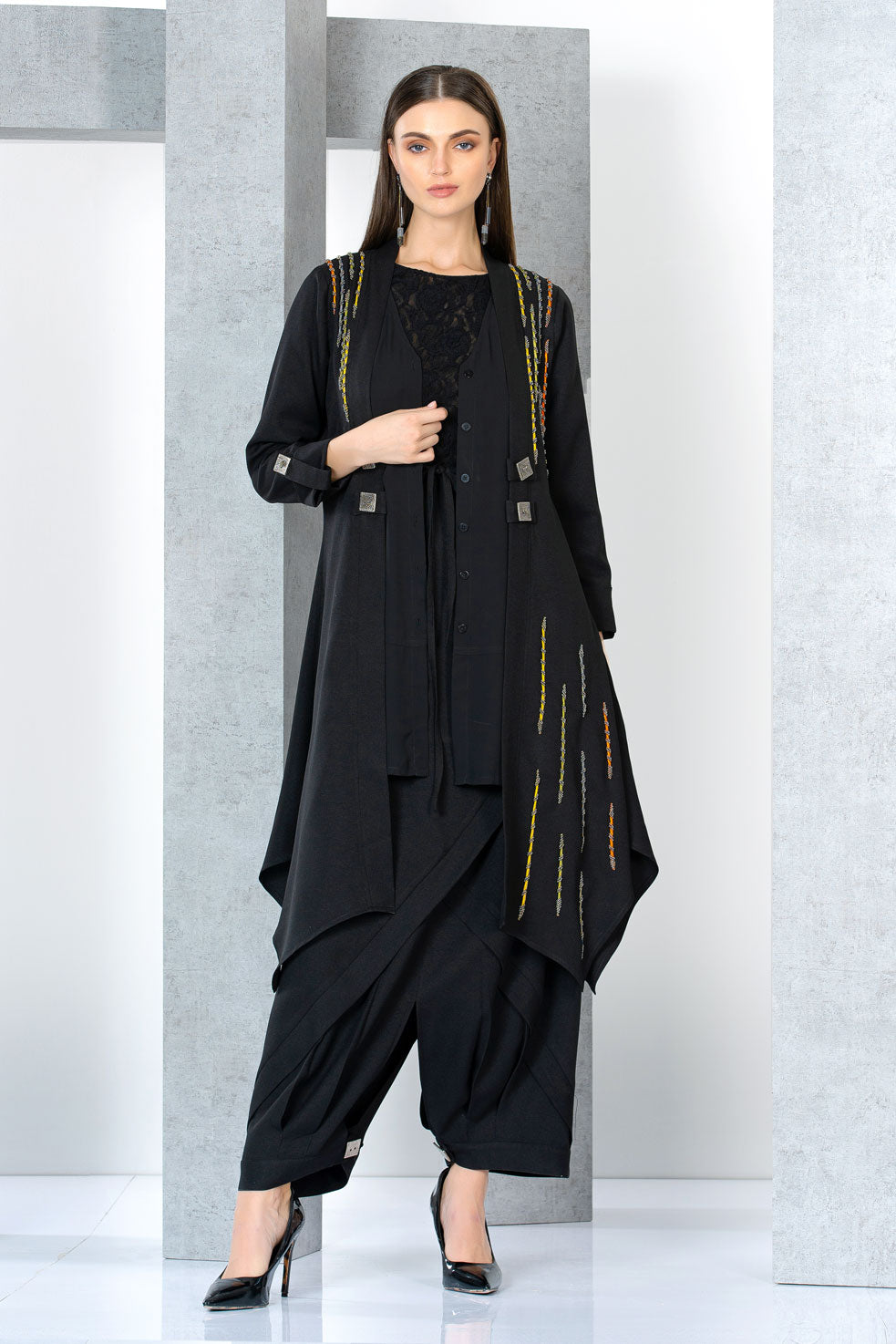 סט שני חלקים ספורט אלגנט. שמלת סרפן חלק עליון מבד מחרה שחור ניתנת לקשירה במותן על ידי שרוך, חלק תחתון מבד סטלה מפנק, מכנס-חצאית שניתן להחלפה ע"י שני כפתורים. עליון טוניקה ארוכה בגזרה מעניינת עם חיתוכים מחורזת בעדינות בעבודת יד בחבל צבעוני בסגנון אתני