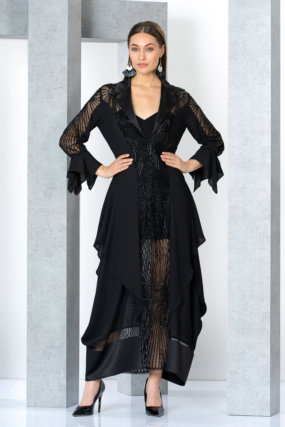 שמלת ערב מהממת בסגנון כפתאן ג'לביה אלגנטית ומדוייקת. שמלת ערב צנועה במידות גדולות מעוצבת משילוב של בד מחורז בעבודת יד, בד שיפון וסאטן עם חיתוכים רבים ומעניינים. מפתח חזה בגזרת וי עם שרוולים ארוכים שקופים מעט. השמלה מגיעה עם שמלת בסיס ארוכה (הדוגמנית לובשת שמלת בסיס קצרה)