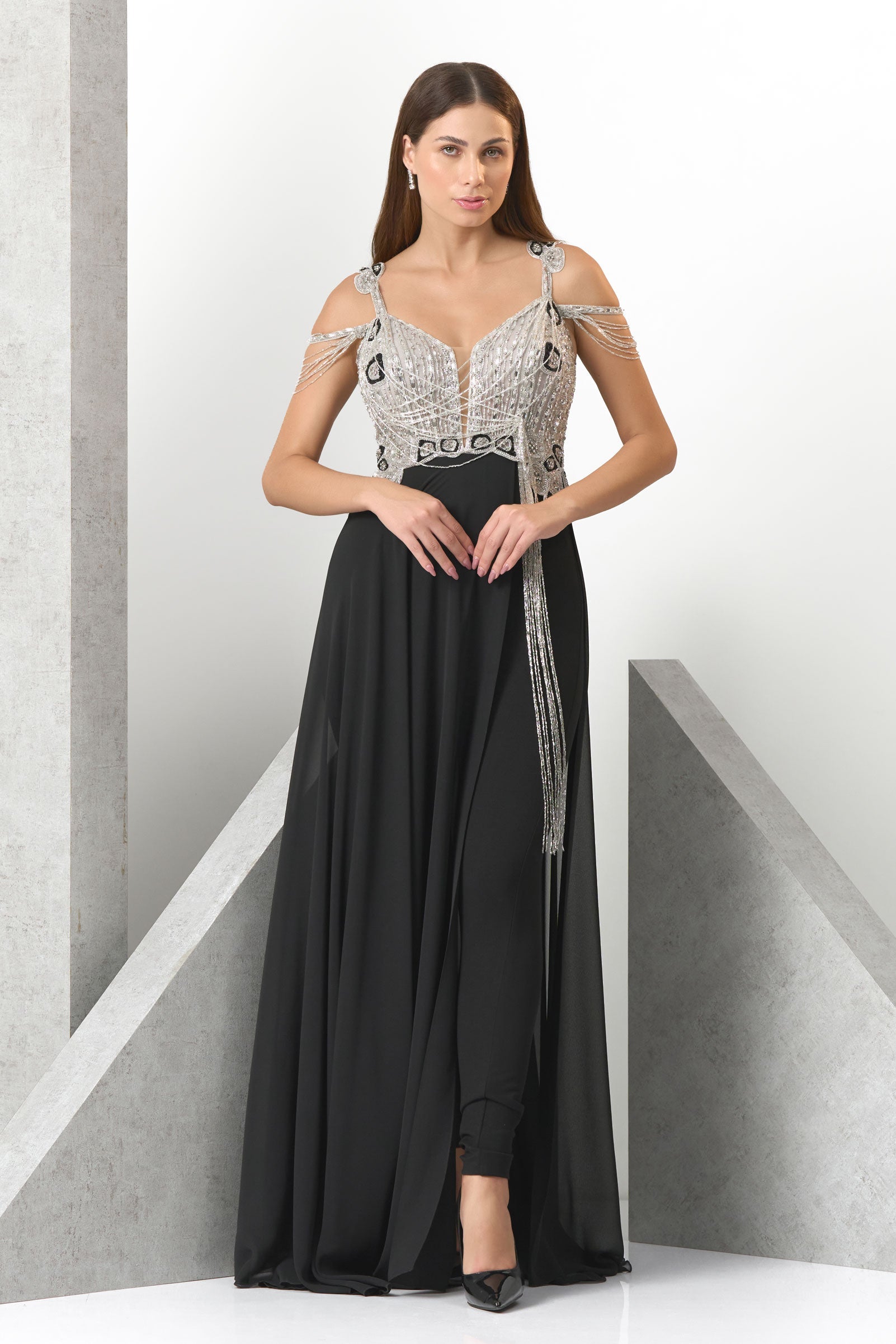 כשנוחות של אוברול ואלגנטיות של שמלה נפגשים! אוברול מושלם מבד מחטב, חלק עליון מחורז בעבודת יד בגזרת מחוכית כתפיות עם שרשראות פרנזים וכריסטלים בגוונים של כסף. חצאית שיפון זורמת שמעניקה מראה יוקרתי ואלגנטי עם שסע צד. בגד ערב מושלם עם נוחות מקסימלית ומראה יוקרתי.