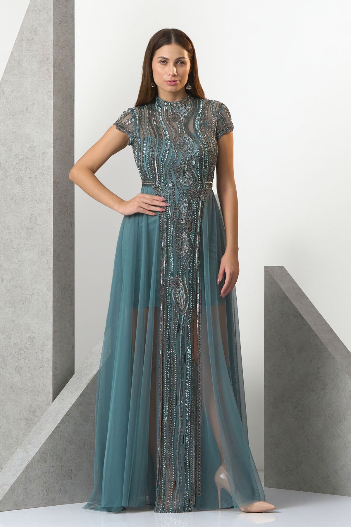 שמלת ערב בגזרת פרינסס קולר, חלק עליון ופס קדמי מלכותי מחורז. שני שסעים צידיים בחצאית ושרוולים קטנים.